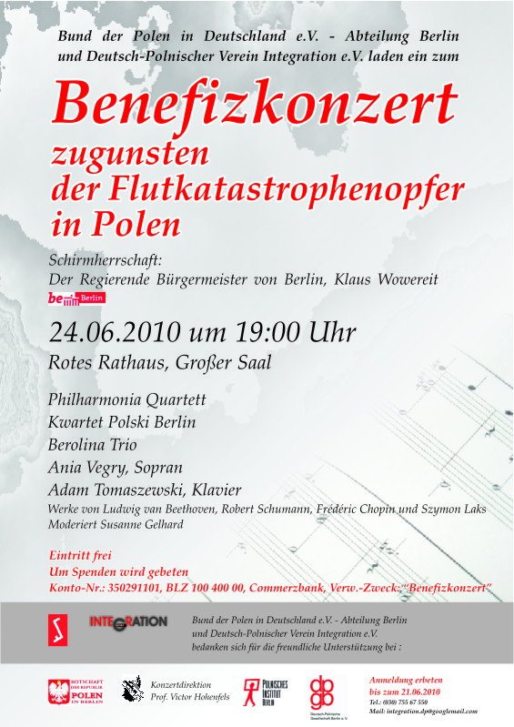 angesichts der großen Hochwasserkatastrophe in Polen, eines Naturunglücks, das grenzüberschreitend ist, und im Zeichen der Solidarität sowie der Anteilnahme mit den Opfern, die oft ihr ganzes Hab und Gut verloren haben, möchten wir, der Bund der Polen in Deutschland e.V. und der Deutsch-Polnische Verein Integration e.V., unterstützt von der Botschaft der Republik Polen, eine Initiative der Mitglieder der Berliner Philharmoniker und des Orchesters der Deutschen Oper Berlin aufgreifen und ein Benefiz-Konzert zugunsten der Opfer der Flutkatastrophe in Polen veranstalten.